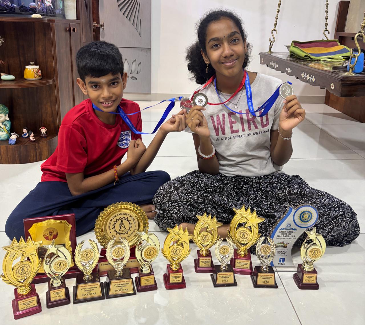 Kausthav and Sahasra are deeply passionate about learning the Bhagavad Gita. They have been studying the Gita from the age of five and have participated in many competitions conducted by Chinmaya Mission and Egmore Sanskrit School. Over the years, they have been recognised as “Stars” and “Rock Stars” in various editions of the Egmore Sanskrit School events. More than the awards, it is a matter of great pride that they are learning one of the most sacred texts of Indian culture. A heartfelt thanks to all their gurus for nurturing this interest and devotion.